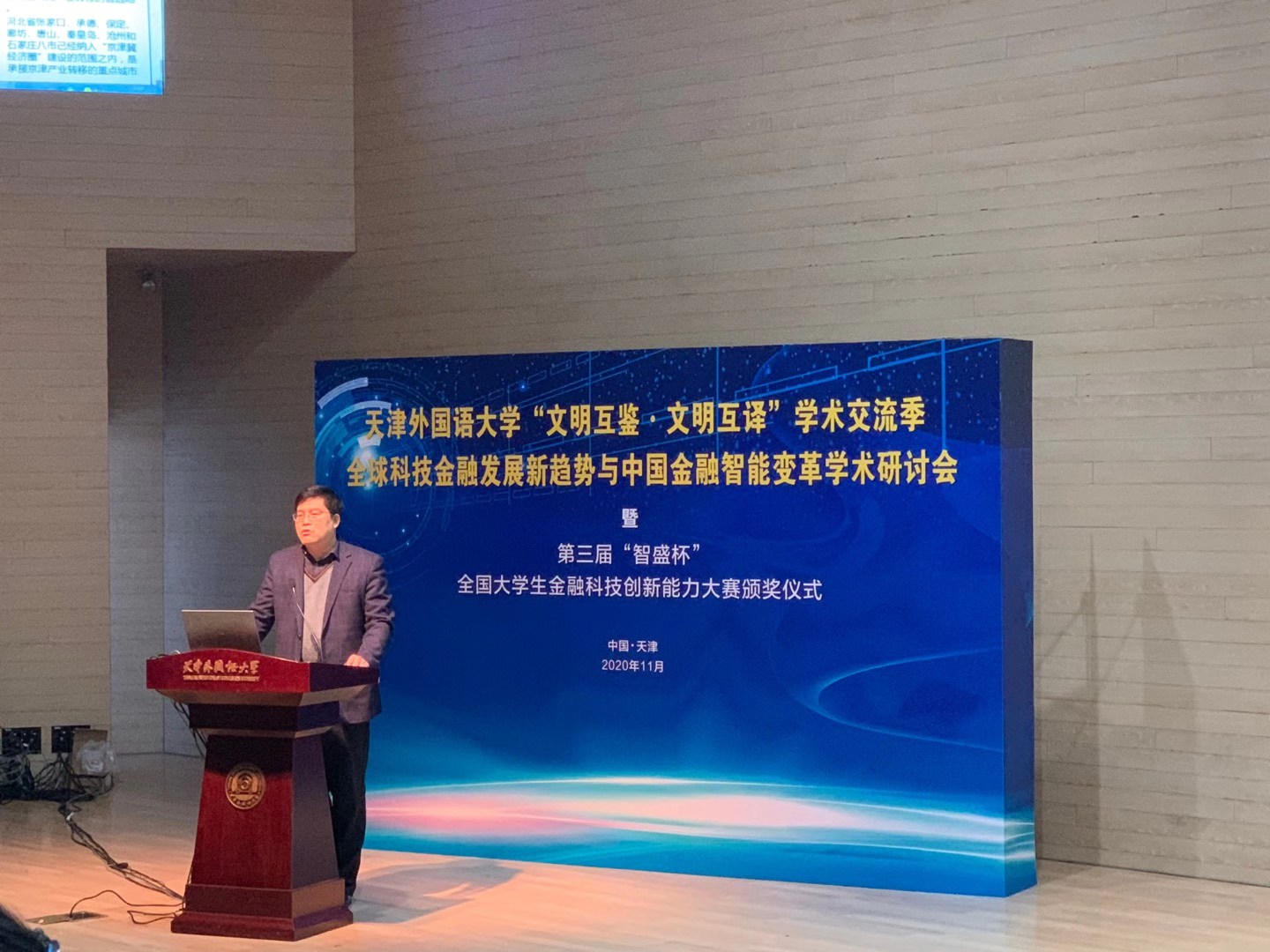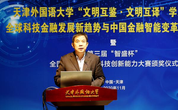 2020年11月8日,第三屆“智盛杯”全國大學生金融科技創(chuàng)新能力大賽頒獎儀式暨天津外國語大學“文明互鑒·文明互譯”學術(shù)交流季——“全球科技金融發(fā)展新趨勢與中國金融智能變革學術(shù)研討會”在天津外國語大學馬場道校區(qū)隆重舉行。此次頒獎儀式采取線上線下融合方式舉辦,未能到達現(xiàn)場的參會人員通過騰訊會議直播參加。