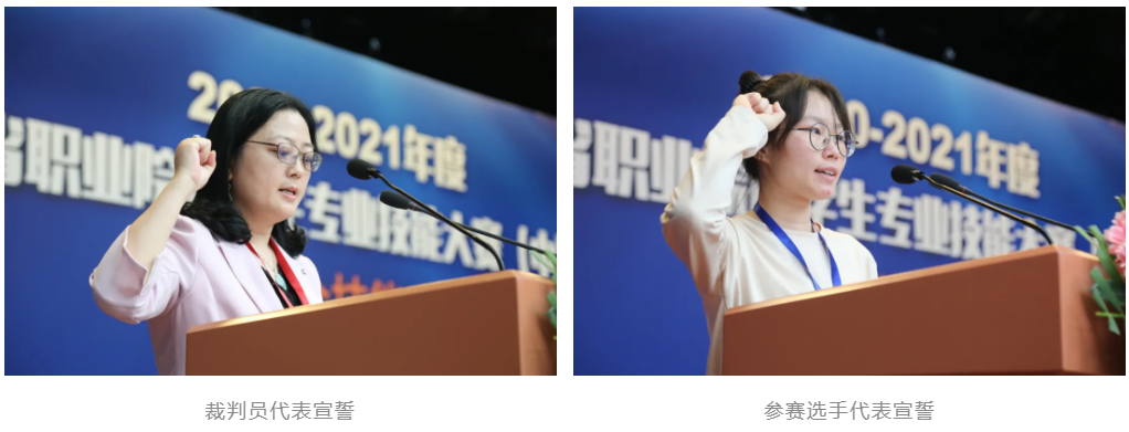 隨后,裁判員代表深圳二職會計部程紅雪部長及參賽選手代表楊妙娜(華強職校選手)莊嚴宣誓,廣東省教育廳職業(yè)院校技能大賽組委辦李謨樹主任宣布大賽開始!