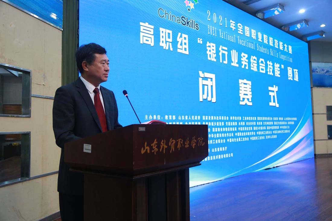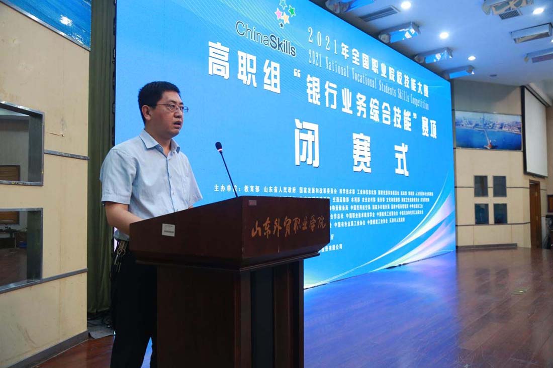 閉幕式上,大賽專家組長(zhǎng)、江蘇省徐州財(cái)經(jīng)高等職業(yè)技術(shù)學(xué)校副校長(zhǎng)張勇對(duì)本次比賽的四個(gè)項(xiàng)目進(jìn)行了點(diǎn)評(píng)。青島市教育工委委員、教育局黨組成員、總督學(xué)李岷,山東省教育廳職業(yè)教育處副處長(zhǎng)李海濤,青島市地方金融監(jiān)督管理局一級(jí)調(diào)研員鞠京福,省商務(wù)廳業(yè)務(wù)聯(lián)絡(luò)辦公室主任姜寶臣,青島農(nóng)商銀行行長(zhǎng)劉宗波,全國(guó)金融職業(yè)教育教學(xué)指導(dǎo)委員會(huì)副秘書長(zhǎng)成銓,泉州輕工職業(yè)學(xué)院商學(xué)院院長(zhǎng)顏建立等出席了閉幕式,山東外貿(mào)職業(yè)學(xué)院院長(zhǎng)刁建東主持閉幕儀式。