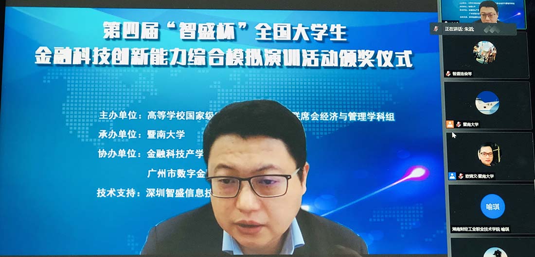 2021年12月4日,由高等學(xué)校國(guó)家級(jí)實(shí)驗(yàn)教學(xué)示范中心聯(lián)席會(huì)經(jīng)濟(jì)與管理學(xué)科組主辦;暨南大學(xué)承辦;金融科技產(chǎn)學(xué)協(xié)同創(chuàng)新聯(lián)盟和廣州市數(shù)字金融協(xié)會(huì)協(xié)辦;深圳智盛信息技術(shù)股份有限公司作為技術(shù)支持的第四屆“智盛杯”全國(guó)大學(xué)生金融科技創(chuàng)新能力大賽頒獎(jiǎng)儀式正式收官。此次頒獎(jiǎng)儀式采取線上方式通過以騰訊會(huì)議直播的形式參加。