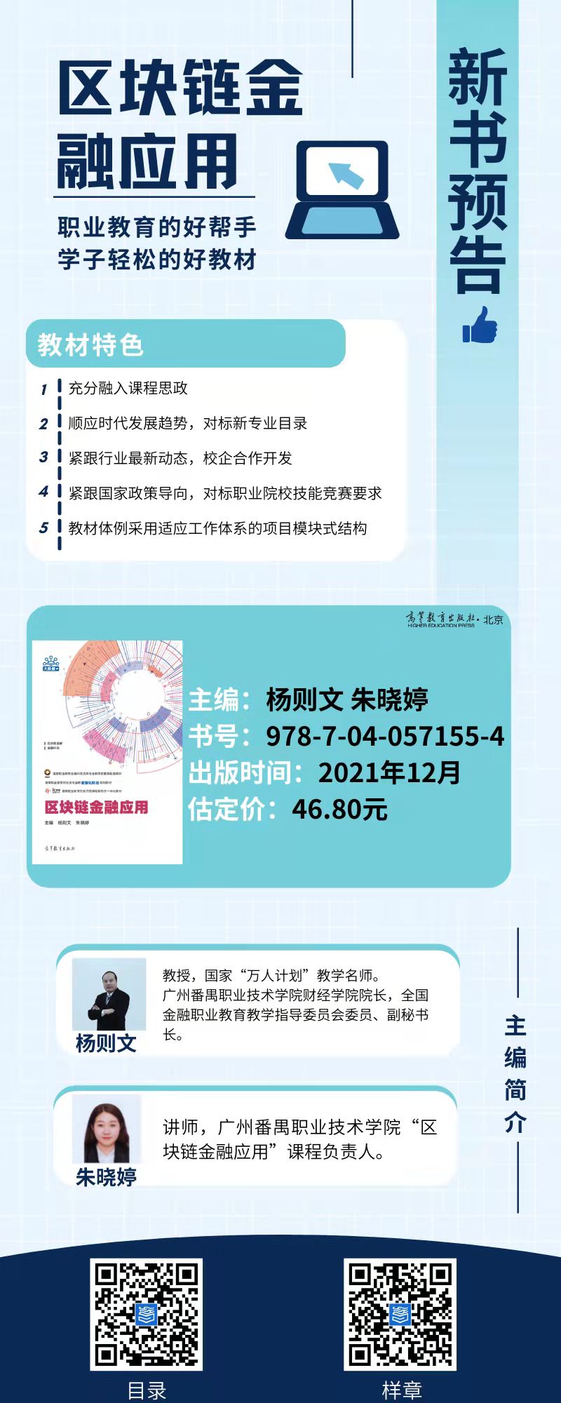 《區(qū)塊鏈金融應(yīng)用》新形態(tài)教材及數(shù)字化課程將同步上市,配套二維碼系列微課及訓(xùn)練平臺。可以實(shí)現(xiàn)知識的隨掃隨學(xué),授課計(jì)劃、課件、MOOC學(xué)院線上課程等數(shù)字化資源樣樣齊全,敬請期待。