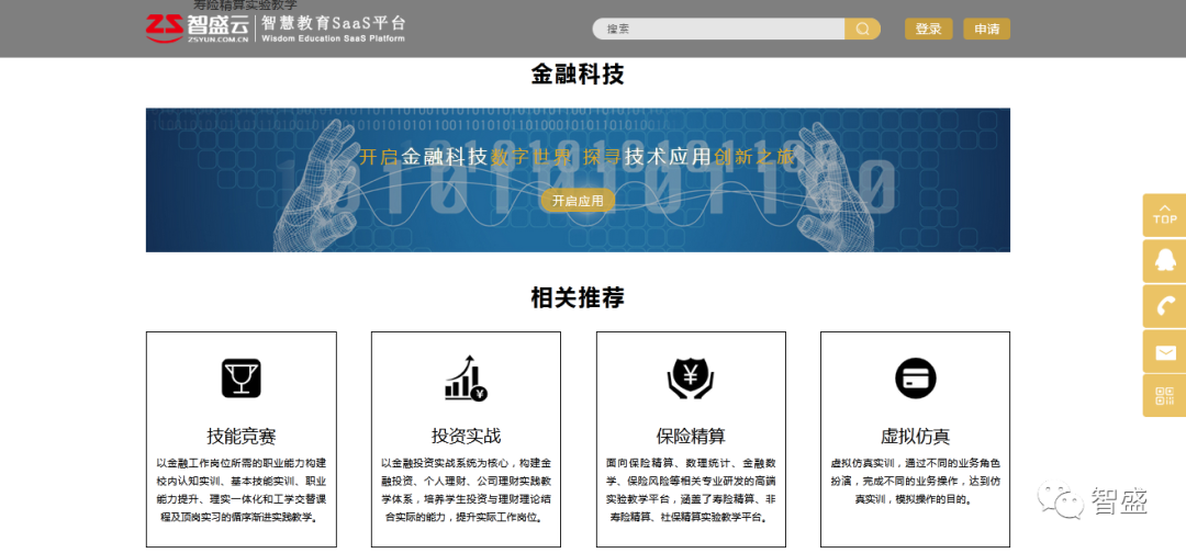 智盛云智慧教育SaaS平臺(簡稱:智盛云)是專門為全國高校金融教育提供全面,專業(yè),實用,貼心的產(chǎn)品和服務(wù)的金融實驗教學(xué)云平臺,與金融類專業(yè)實際教學(xué)相切合,集“教、學(xué)、做、考、賽”于一體的在線服務(wù)云平臺。
