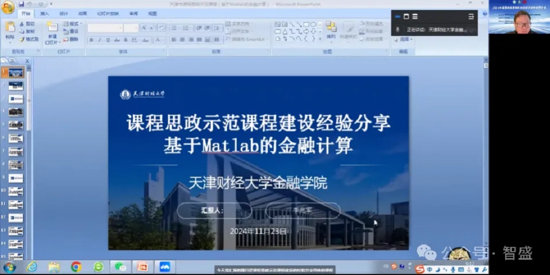 天津財(cái)經(jīng)大學(xué)金融學(xué)院李兆軍教授就基于 Matlab 的金融計(jì)算課程思政示范課程建設(shè)作經(jīng)驗(yàn)分享。他先介紹課程由《金融計(jì)算與量化分析》教改而來(lái),經(jīng)歷疫情上網(wǎng)課等,已獲校、市相關(guān)成果。接著從課程基本情況、目標(biāo)完成、教學(xué)手段、思政結(jié)合、改革創(chuàng)新點(diǎn)五方面展開匯報(bào),提及依據(jù)教育部文件開展建設(shè),闡述課程各模塊內(nèi)容、考核方式,強(qiáng)調(diào)教學(xué)手段多樣,如講知識(shí)、小組討論、案例教學(xué)等,還談及網(wǎng)絡(luò)資源利用及思政融入需注意事項(xiàng),包括突出職業(yè)、愛國(guó)、擔(dān)當(dāng)、工匠精神等,最后總結(jié)課程的基本指標(biāo)、創(chuàng)新點(diǎn)及建設(shè)過(guò)程是不斷完善的。